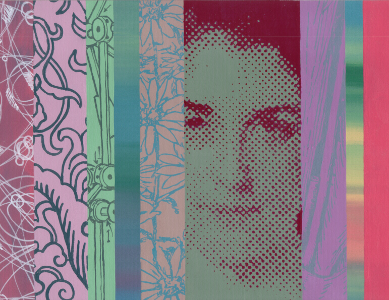 | The only genomic painted on paper, Simone de Beauvoir measures just 8" x 10"—a compact work created for a benefit auction. Its scale is modest, but its logic is precise. The canvas moves through ornamental bands, mechanical diagrams, halftone portraiture, and chromatic drift. The central face—rendered in green dots against red—feels vintage, stylized, and emotionally suspended. It’s not Beauvoir. It’s a placeholder. A speculative relation. A visual echo of inheritance that remains unresolved.